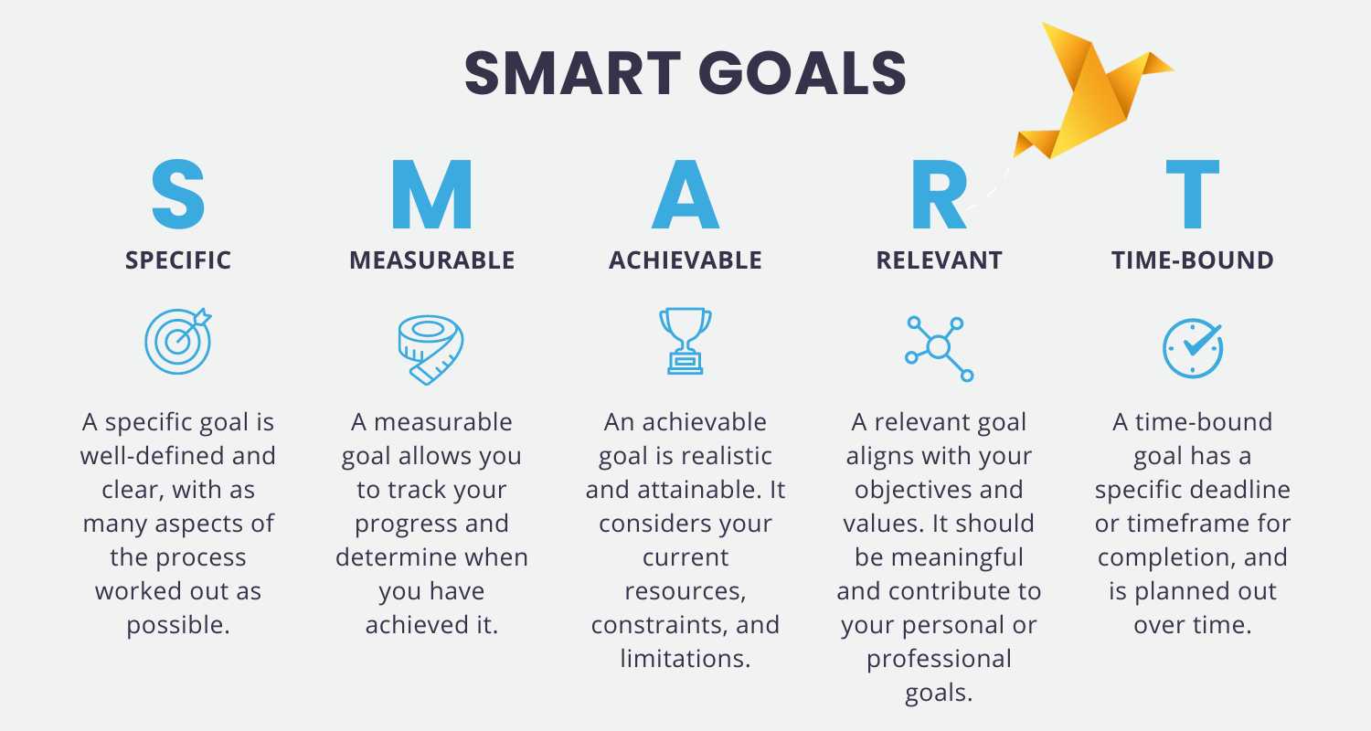 “SMART” goals are key. Specific, Measurable, Achievable, Relevant (or Realistic), and Time-bound goals should make up most of our goals. Even though SMART goals are key, do not fear dreaming BIG. Sometimes it takes a big goal to really encourage and inspire us. What may seem unrealistic now, might not be as far out of your reach as you think.